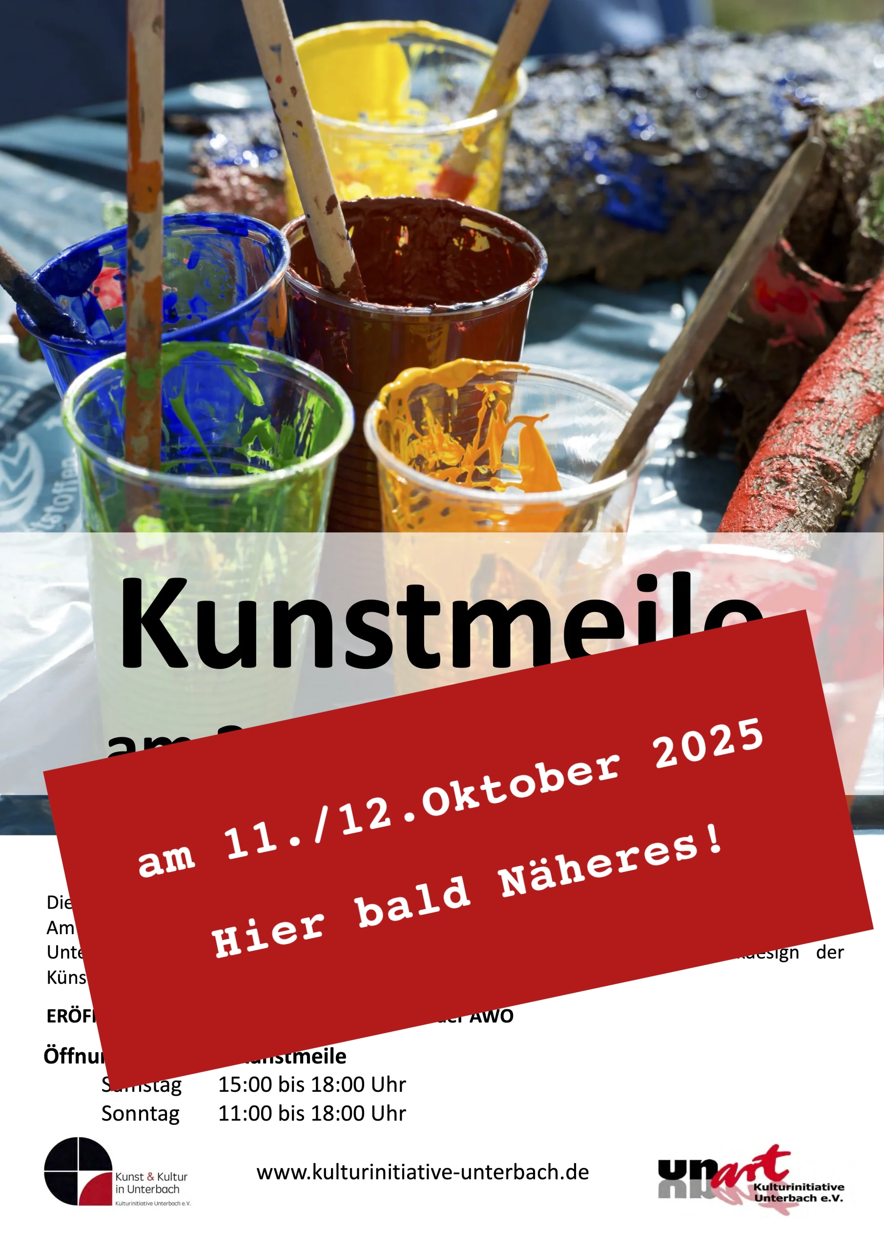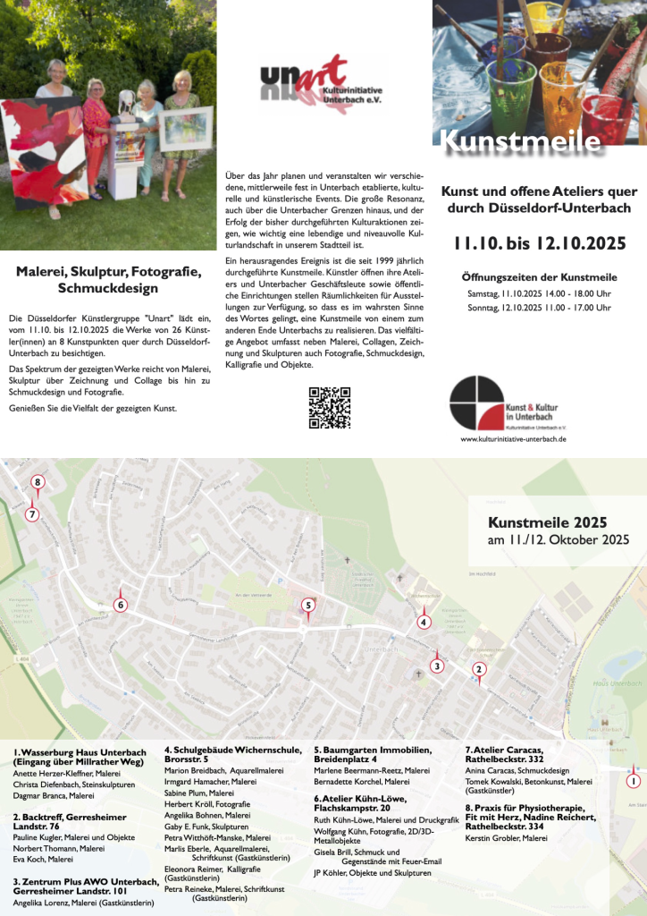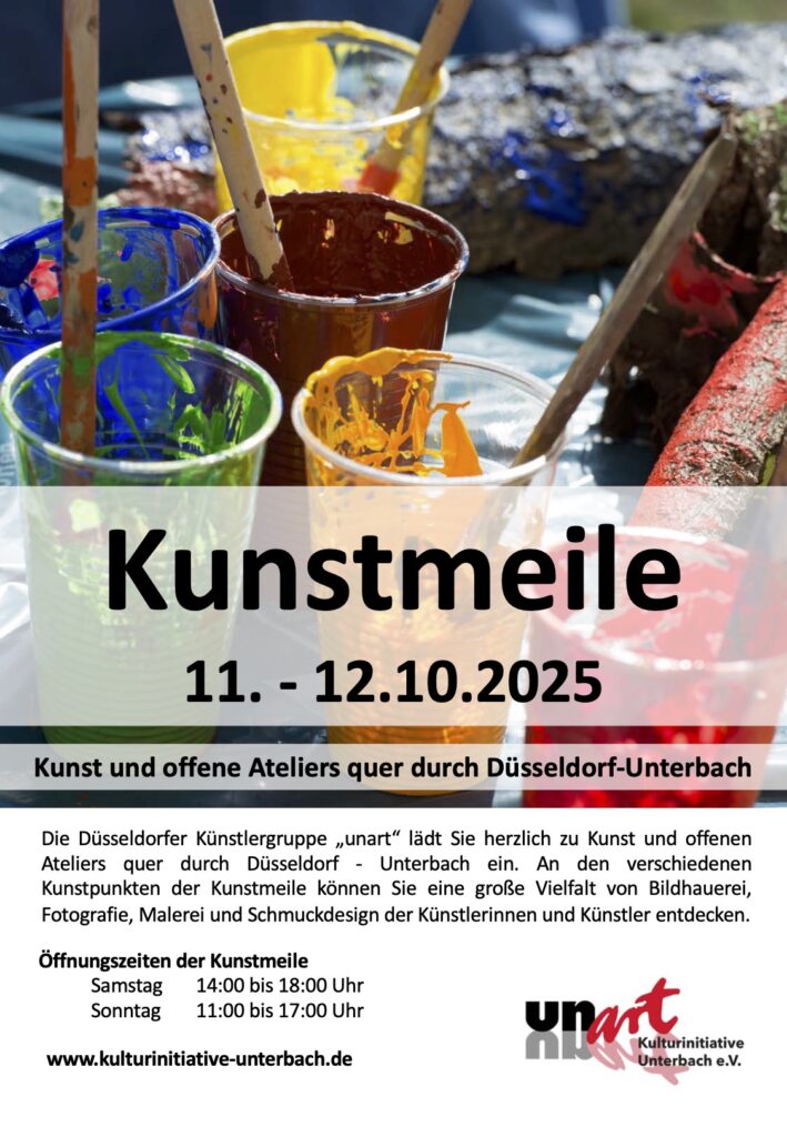 Die Düsseldorfer Künstlergruppe „unart“ lädt jedes Jahr im Oktober zur Kunstmeile ein. Für die Kunstmeile stellen Unterbacher Geschäftsleute, Institutionen und Bürger zahlreiche Räumlichkeiten zur Verfügung und mehrere Künstler öffnen ihre Ateliers. Die gezeigte Kunst bildet ein Pfad voller Kreativität quer durch Düsseldorf-Unterbach. Genießen Sie die Vielfalt der gezeigten Kunst. Der Eintritt ist frei und die Künstler freuen sich auf ein interessiertes Publikum und zahlreiche Gespräche.